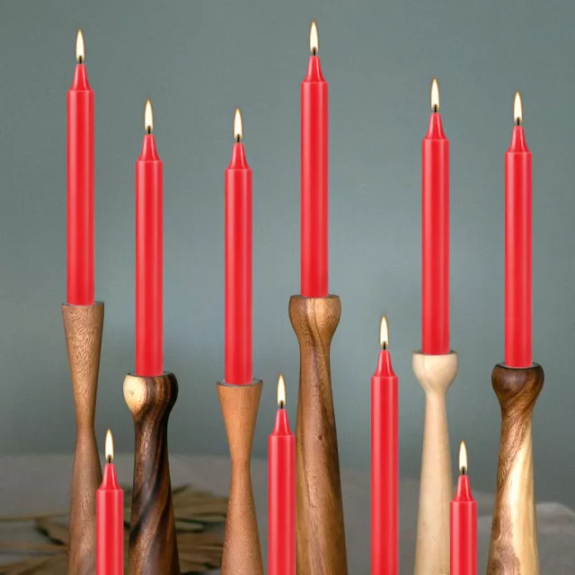 Add timeless charm to your home or event with this set of 12 hand-pulled red taper candles. Measuring 3.9 inches tall and 0.4 inches wide, these slender candles bring a warm, inviting glow to any space. Their smooth finish, rich red color, and straight, refined lines make them a striking detail whether on the dining table, mantel, or part of a centerpiece. Crafted from high-quality wax, each candle is designed to burn cleanly and consistently, leaving no mess behind.